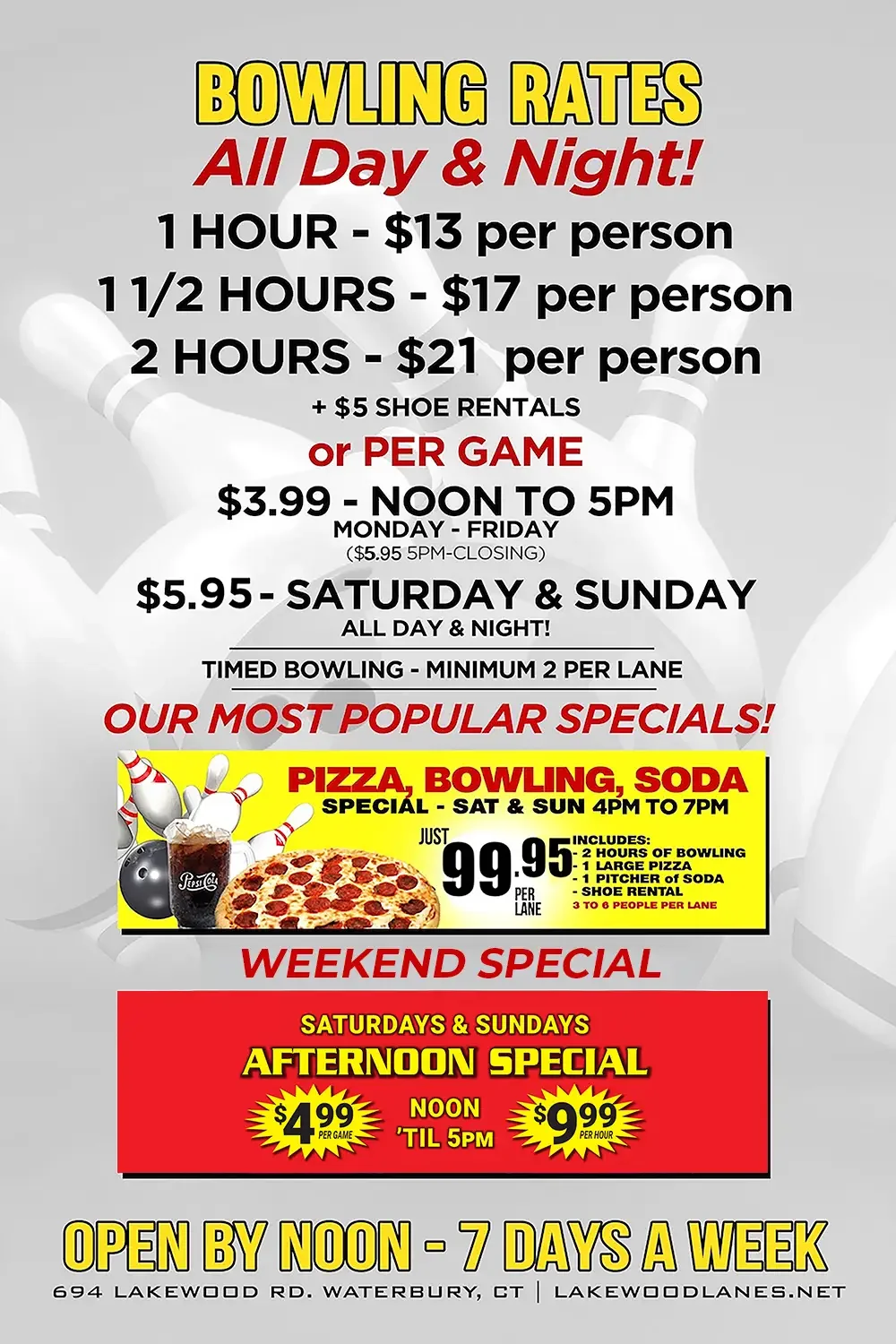 Check out our latest specials and make your next visit even more fun! Whether you're planning a family outing, a night with friends, or just want to take advantage of great offers, we've got something for everyone at Lakewood Lanes.